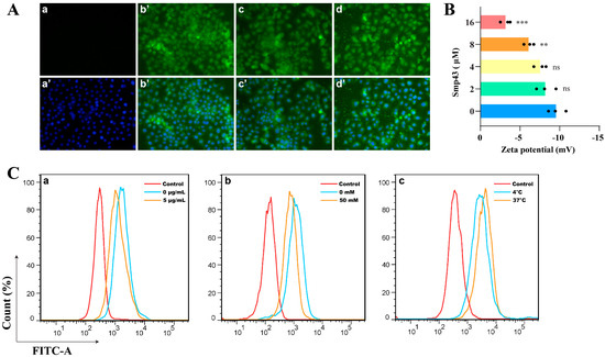 Smp43 is internalized into A549 cells. (A) Detection of the amount of Smp43 entering A549 cells. The upper panel represents A549 cells stained with 4 μM of FITC-labeled Smp43, and the merged images of cells stained with FITC-labeled Smp43 and DAPI are displayed in the lower panel. The control cells are presented in panels (a,a’); the cells treated with Smp43 at different time points (6, 12, and 24 h) are shown in panels (b–d,b’–d’), respectively. Photographs were obtained at 400× magnification. (B) Zeta potential assay. The variation in membrane potential was observed after the cells were co-incubated with Smp43 for 10 min, and the control group was treated with PBS. Data from A549 cells treated with different concentrations of Smp43 were presented in different colors. (C) Effects of heparin (panel (a)), NH4Cl (panel (b)), and different temperatures (panel (c)) on the amount of Smp43 entering A549 cells. The action time was 6 h, and cells without any treatment were considered control. Data are represented as the mean ± SD (n = 3). The significant differences between the treated and control group are presented as ** p < 0.01 and *** p < 0.001. “ns” stands for not significant (p > 0.05).