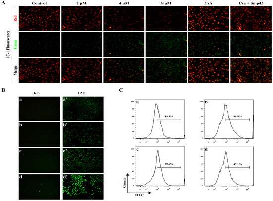 The changes in mitochondrial membrane potential were determined with a commercial JC-1 staining kit. Briefly, A549 cells were treated with Smp43 at different concentrations (2–8 μM) for 6 h. The collected cells were washed with PBS, re-suspended in the JC-1 working solution (500 μL), and incubated for 20 min at 37 °C with 5% CO2. Subsequently, the cells were harvested, washed, and re-suspended in a 1× incubation buffer two times. The changes in mitochondrial potential caused by Smp43 were observed. Cyclosporin A (CsA) was used as the positive control.