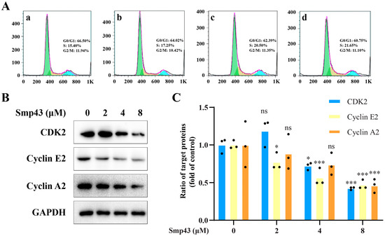 Smp43 interferes with cell cycle distribution in A549 cells. (A) Cell cycle distribution analysis via flow cytometry. The control cells are presented in panel (a); the cells treated with Smp43 (2, 4, and 8 μM) are shown in panels (b–d), respectively. (B) Western blot analysis of Smp43-treated A549 cells. (C) Quantification of the Western blot assay. Data are represented as the mean ± SD (n = 3). The significant differences between the treated and control group are presented as * p < 0.05 and *** p < 0.001. “ns” stands for not significant (p > 0.05).