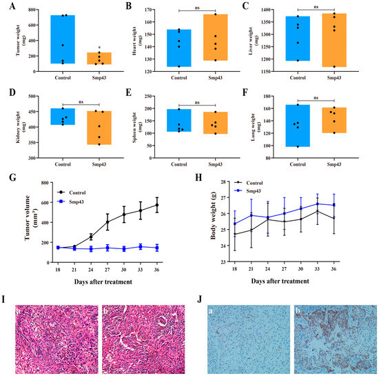 The in vivo antitumor effect of Smp43. (A) Tumor weight after 18 days of Smp43 treatment. (B–F) The changes caused by Smp43 on the heart, liver, kidney, spleen, and lung, respectively. (G) Tumor volume changes caused by Smp43. (H) The changes in body weight of mice. (I) Pathological images of tumor tissue obtained via H&E staining from control (a) and Smp43-treated mice (b). (J) Cleaved caspase 3 immunohistochemistry in control (a) and Smp43-treated mice (b). Photographs were obtained at 200× magnification. Data are represented as the mean ± SD (n = 3). The significant difference between the treated and control group is presented as * p < 0.05. “ns” stands for not significant (p > 0.05).