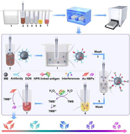 The procedure of multicolor visual strategies for DON detection is illustrated in Figure 1. The process was carried out through an automated multiplex reaction system reported in our early work [32,33]. The reagents were encapsulated into the 7 wells of the auxiliary kit in sequence, including dilute solution (PBS, 4.8 mL), IMBs (600 μL), washing buffer (0.1% Tween-20 in PBS, 1 mL), HRP-linked DON antigen (600 μL), washing buffer (0.1% Tween-20 in PBS, 1 mL), TMB two-component substrate (100 μL), and Au NBPs (100 μL). The relevant parameters of the reaction program were edited as shown in Table S1. For DON detection, 200 μL of the sample was added into a dilute solution and the IMBs were transferred by a magnetic stick to capture the target. After immunoreaction, washing, enzyme catalysis, and Au NBP etching, the product was measured by a microplate spectrophotometer.