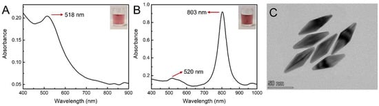 UV–vis spectrum and corresponding optical photographs of Au seeds (A) and Au NBPs (B). (C) TEM images of Au NBPs.