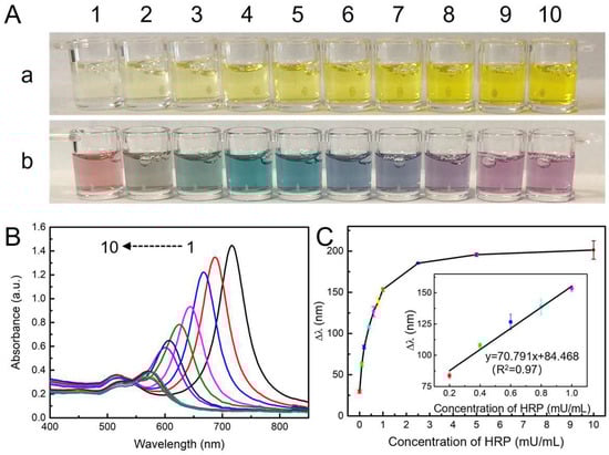 (A) Optical photographs of produced TMB2+ solutions before (a) and after (b) the addition of Au NBPs. (B) The UV–vis absorption spectra of Au NBPs are etched by various concentrations of TMB2+. From 1–10, concentrations of HRP were 0, 0.1, 0.2, 0.4, 0.6, 0.8, 1.0, 2.5, 5.0, and 10.0 mU/mL, respectively. (C) Plot of Δλ vs. concentration of HRP. Inset: the linear relationship between Δλ and the concentration of HRP from 0.2 to 1.0 mU/mL.