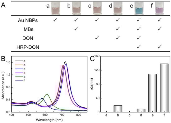 Feasibility of the DON detection principle. (A) Table of reagents added to each tube. Inset: optical photographs of the corresponding color tonalities of Au NBPs colloidal dispersion. UV–vis absorption spectra (B) and Δλ (C) of Au NBPs under the corresponding conditions.