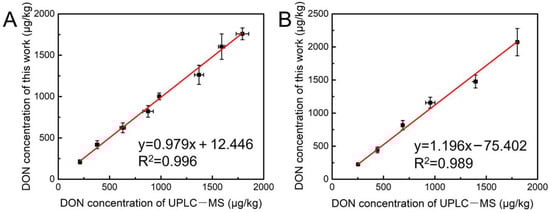 The reliability of the developed method was demonstrated by detecting naturally contaminated samples of wheat and maize, and the results were listed in Table 1. It showed that the recovery of wheat was 95.5–105.7% with RSD of 4.06–11.80% and the recovery of maize was 93.7–107.5% with RSD of 5.15–10.03%, proving that the method provided good accuracy and precision. The results were verified by ultra-performance liquid chromatography–mass spectrometry (UPLC–MS). As shown in Figure 6, the regression analysis between the two methods indicates that the results from the proposed method agreed well with those obtained from the UPLC–MS.