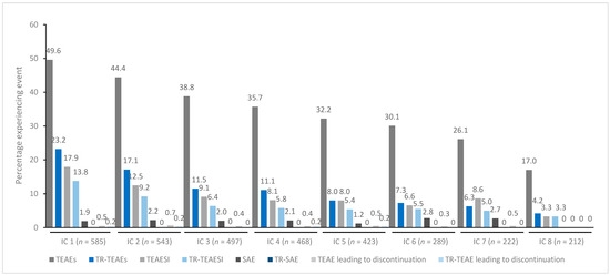 In general, treatment for up to eight repeated cycles did not increase the incidences of any TEAE category (Figure 1, Figure 2, Figure 3, Figure 4 and Figure 5). Although some subjects who received incobotulinumtoxinA for cervical dystonia received additional cycles (up to 13), subject numbers were very small (≤15) relative to earlier cycles; therefore, analyses for these would not lead to meaningful results.