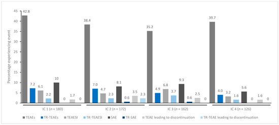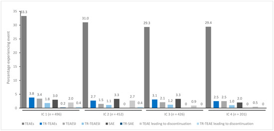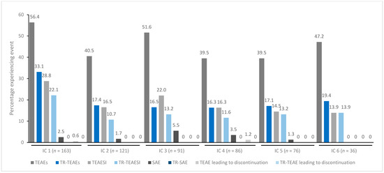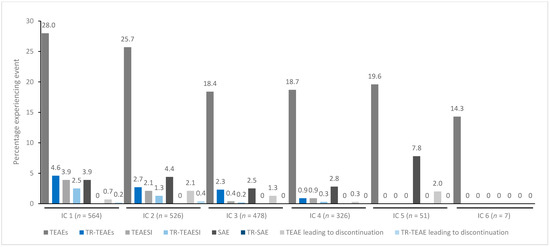 TEAE incidence by treatment cycle in patients with UL spasticity treated with incobotulinumtoxinA. IC, injection cycle; INCO, incobotulinumtoxinA; TEAE, treatment-emergent adverse event; TEAESI, treatment-emergent adverse event of special interest (potentially indicative of toxin spread); SAE, serious TEAE; TR, treatment-related; UL, upper limb.