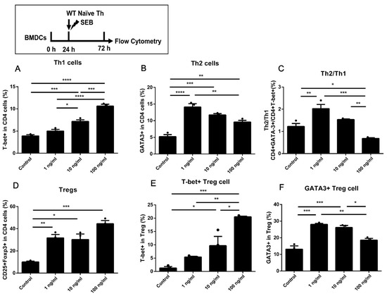 In Figure 6, a time course similar to Figure 5 was adopted. The BMDCs were cultured alone for 24 h and then co-cultured with naïve Th cells under stimulation of SEB. The stimulation of SEB led to more proportions of Th1, Th2, and Treg cells than Control in all doses (Figure 6A,B,D). Additionally, a high dose of SEB (100 ng/mL) led to more expression of T-bet and less expression of GATA-3 in Th cells and Tregs compared to a low dose of SEB (1 ng/mL) (Figure 6B,F). Moreover, a significantly higher ratio of Th2/Th1 was only found in the 1 ng/mL group compared to the Control (Figure 6C). Additionally, a lower Th2/Th1 ratio was induced by a higher dose of SEB (100 ng/mL).