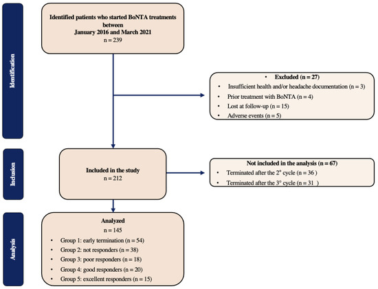 Two hundred thirty-nine subjects started BoNT-A treatment at IRCCS Mondino Foundation between January 2016 and March 2021. The patients’ disposition is illustrated in Figure 1.