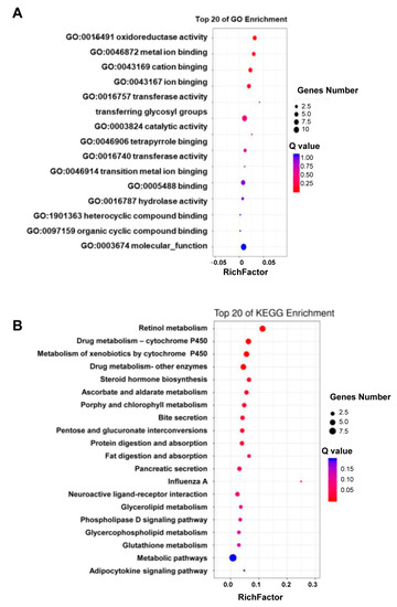 Except for 4 DGEs that encoded synaptic vesicle 2-related protein, cytochrome b5, cuticle protein 4, or hemolin, the rest of the 48 DGEs encoded various enzymes that played a role in detoxification (nine P450s, six carboxylesterases, three UGTs, two GSTs, one epoxide hydrolase, and one alcohol dehydrogenase), digestion (seven proteases), lipid metabolism (two acyltransferase, one neutral lipase, one fatty alcohol acetyltransferase, and one androgen-induced gene 1 protein), ecdysone homeostasis (three ecdysteroid 22-kinases, one 3-dehydroecdysone 3alpha-reductase), retinol metabolism (two retinol dehydrogenases) or cuticle sclerotization (laccase) (Figure 2C). Consistent with their functional annotations and categories, the 48 DGEs were mainly enriched in the Gene Ontology (GO) terms of “oxidoreductase activity (GO:0016491”, ”metal ion binding (GO:0046872)”, and “cation binding (GO:0043169)” (Figure 3A) and the KEGG pathways of retinol metabolism, drug metabolism-cytochrome P450, metabolism of xenobiotics by cytochrome P450, drug metabolism-other enzymes, steroid hormone biosynthesis, protein digestion and absorption, and fat digestion and absorption (Figure 3B).