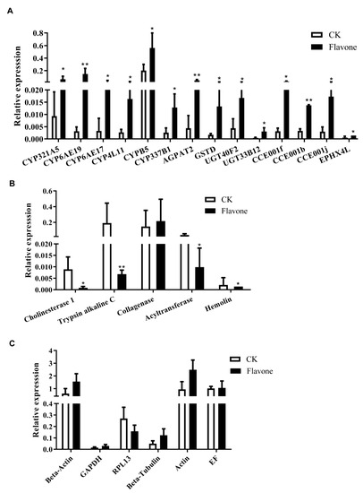 Fourteen flavone-upregulated genes (six P450s (CYP6AE19, CYP6AE17, CYP321A5, CYP337B1, CYP4L11, CYPB5), four transferases (UGT33B12, UGT40F2, GSTD, AGPAT2), and four carboxylesterases (CCE001f, CCE001b, CCE001j, EPHX4L)), five flavone-downregulated genes (1-acyl-sn-glycerol-3-phosphate acyltransferase alpha-like; cholinesterase 1-like; trypsin, alkaline C-like, hemolin and collagenase-like), and six non-flavone-responsive genes (Actin, beta-Actin, beta-Tubulin, Elongation factor 1 alpha (EF), Glyceraldehyde-3-phosphate dehydrogenase (GAPDH), and Ribosomal protein L13 (RPL13)) were verified by qRT-PCR. qRT-PCR analysis showed that all the 14 flavone-upregulated genes revealed by RNA-seq had significantly higher expression (one-tailed t test at p < 0.05) in the flavone-treated larvae than in the control larvae (Figure 4A). Four out of the five flavone-downregulated genes were expressed at a significantly lower level (one-tailed t test at p < 0.05) in the flavone-treated larvae (Figure 4B) and no differences were observed for the six non-flavone-responsive genes between the flavone and control groups (two-tailed t test at p < 0.05) (Figure 4C). Correlation analysis uncovered that the relative expression levels of these genes obtained by qRT-PCR matched well with their FPKM values derived from RNA-seq (R2 = 0.8386).