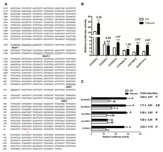 The spectrum of flavone up- and downregulated genes was revealed by transcriptomic analysis of the midgut of cotton bollworm treated with flavone, and an ARE-like cis-acting element in the promoter of CCE001j was found to determine whether the gene was induced by flavone.