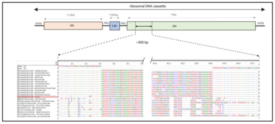 Primers were designed manually using a nucleotide alignment of the D1 and D2 regions of the rRNA large subunit (LSU) of 47 Alexandrium reference sequences, with 24 species, using BioEdit [63]. Additionally, 10 other dinoflagellate genera were included to assess specificity. The aligned sequences and selected primers are available in Supplementary File (S5). Conserved regions of 36 bases were selected in D1 and D2 regions for the forward and reverse primers, respectively, to amplify a fragment with approximately 500 bp. Any polymorphism in position(s) of the annealing regions was accounted for with degeneracies. The size of the primers designed varied between 30 and 36 bases (Table 1); shorter primers were selected by removing from the end that resulted in the removal of degenerated positions [64]. Figure 1 shows location of primers in the rDNA cassette and provides an example alignment, including Alexandrium.