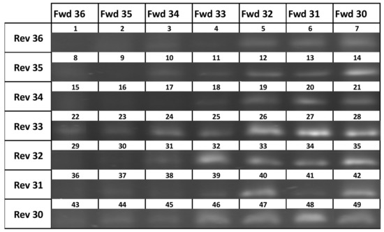 Primer performance matrix. Numbers refer to reaction number with gel electrophoresis bands at ~500 bp. (original Gel available in Supplementary File S1).
