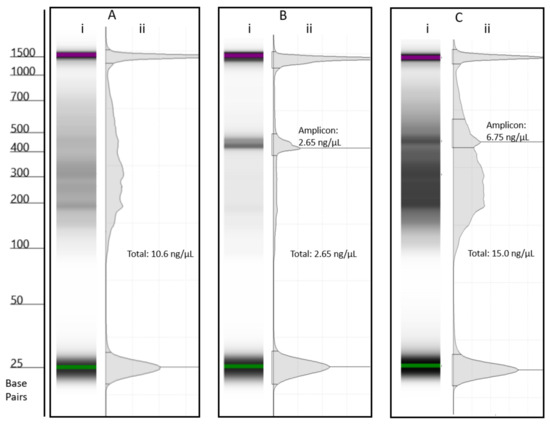 Environmental samples analysed by capillary electrophoresis showing a (i) gel and (ii) chromatogram for: (A) a negative sample with an interference peak from non-specific amplification, (B) a positive sample with no interference peak, and (C) a sample experiencing very low levels of amplification and a significant level of interference. Note: the peaks at 25 and 1500 bp are reference peaks. Concentrations for the amplicon and total concentration are shown.