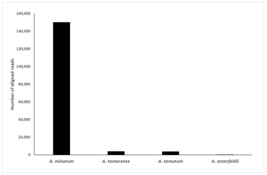 Figure 4 shows the result of aligning sequences from a mock community sample spiked with A. minutum against references for Alexandrium spp. in real time using MinKNOW 5.4.3. The reference list consisted of 50 sequences with 23 distinct species. In this sample, 94.9% of the reads were found to correctly align with the A. minutum, with data available in real time, throughout sequencing. Unfiltered, real-time alignments for other species tested resulted in similar proportions of reads aligning against the correct reference (A. tamarense 95.3%, A. catenella 99.8%, A. pacificum 99.4%, and A. tamutum 98.7%). As the alignments occurred in real-time, it was possible to have an indication of what species were present within minutes of starting sequencing, dependent on the sequencing rate. This indicated that the generation of consensus sequences and phylogenetic analysis may not be necessary with further testing, and real-time alignment may be adequate for species identification. Furthermore, as nanopore sequencing improves in accuracy, it is likely that there will be less need for the generation of consensus sequences in the future [48,49]. This will be further assisted by the adoption of adaptive sampling and adaptive sequencing, which allow for online sample enrichment [50,51].