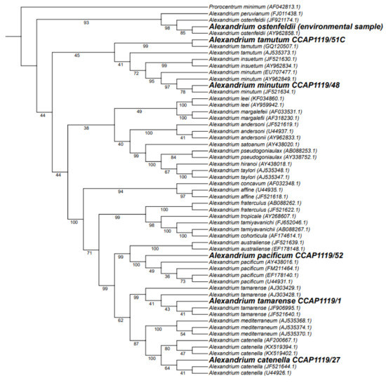 The phylogenetic trees generated for this study used 50 Alexandrium reference sequences covering 23 species, as well as Prorocentrum minimum as an outgroup. The same sequences were used as were originally included in the manuscript by T. Shikata et al. [43]. An example of the phylogenetic tree is shown in Figure 5, which highlights sequences generated by the assay. Although some branches of the tree have low bootstrap scores (<75), all of the branches separating species were well supported (>95), except for the branches between A. margalefeii and A. lee; A. hiranoi and A. taylori; as well as the branches between A. tamutum, A. inseutum, and A. minutum.