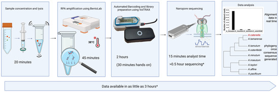 Conversely, sea water analysis is performed using the Utermöhl light microscopy method, a technique that has barely changed in nearly a century [22,23]. The longevity of its application highlights its efficacy, but it is time consuming and challenging to identify organisms to species level, often resulting in poor correlations with toxicity [24,25]. This is primarily due to the occurrence of both toxic and non-toxic species within the sampling waters [26]. To address this, a variety of alternatives have been developed using a wide array of technologies, many of which have made use of nucleic acid detection techniques, usually using the polymerase chain reaction (PCR) to ensure adequate sensitivity [27]. Adoption of these assays has not been widespread, as they usually target a specific strain or species, meaning that multiple assays would need to be run for each variant that posed a hazard. An alternative is to use a PCR assay with a lower degree of specificity, which could detect any Alexandrium spp., but would have no discriminatory power [28]. This could be used as a screening method, with positive samples forwarded for speciation by, for example, DNA sequencing [29]. One of the drawbacks of using PCR is the requirement for samples to be free from contaminants, for example, humic acids, which can inhibit the reaction and provide false negatives [30]. DNA extraction kits that purify DNA to a sufficient quality that is suitable for PCR can be expensive and laborious, a significant drawback when considering incorporation into a routine monitoring program. Recombinase polymerase amplification (RPA) is an alternative that has several benefits: it is isothermal (37–41 °C), rapid (<40 min), and not as susceptible to matrix inhibition [31]. Although not widely used for routine testing, sequencing is commonly used for research purposes. Until recently, the most widely adopted technology for high throughput sequencing consisted of sequencing relatively short fragments of DNA in parallel, using clonal amplification and sequencing by synthesis, commonly referred to as next generation sequencing [32,33,34,35]. However, the capability to sequence long, single strands of DNA in parallel and in real-time marked a technological breakthrough, which some refer to as third-generation sequencing [36]. This capability is predominantly provided by Pacific biosciences (Pacbio) and Oxford Nanopore Technologies (ONT), with nanopore sequencing technology being more widely adopted. This is, to some degree, due to the release of the MinION, a small, low-cost sequencing platform that generates data in real-time using transmembrane protein channels [37,38]. Although individual read accuracies are lower on ONT platforms, it is possible to use bioinformatics to generate consensus sequences that provide higher accuracies (>99.99%) [39,40]. Due to the small physical size and low cost of the MinION, it is possible for it to be used outside of the laboratory environment [41,42].