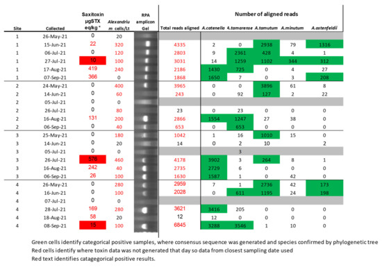 The PST producing A. minutum was observed with the lowest abundance of reads, and its presence was only confirmed in three samples using the RPB kit [58]. It was noted that the species presence was confirmed on each occasion, and levels of PST in shellfish were detected. Furthermore, although not confirmed by the generation of a consensus sequence, there were numerous reads aligning with the species from the site one sample that had levels of PST detected on the 15 June.