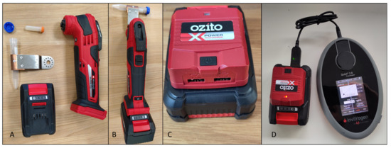 Cell lysis was achieved using a customized cordless oscillating multifunctional power tool (Einhell Varrito, EAN: 4006825618648). Fitted to the power tool was an adapted blade that held a 15 mL nylon centrifuge tube, into which lysis tubes were inserted and packed, so there was no movement independent of the outer tube (see Figure 8A,B). The device, referred onward as the “Osci-lyser”, delivered a rotational movement of 3.2°, and its adapted blade provided an 8.5 cm throw, resulting in approximately 5 mm movement on each oscillation. It had a variable speed selector, ranging from 183 to 333 Hz. The lowest speed was used for 20 s to achieve cell lysis in the study. After lysis, the sample was centrifuged for 1 min at 8000 rpm using the Bento lab before a 13.2 µL aliquot was taken for RPA amplification.