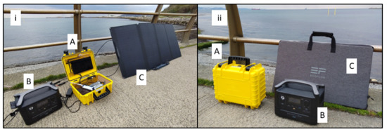 Field deployable sample preparation tools: (A) component parts of Osci-lyser, (B) the Osci-lyser assembled and ready to use, (C) USB adaptor for battery, providing 1.0- and 2.1-amp outputs, (D) Battery powering Qubit 2.0.