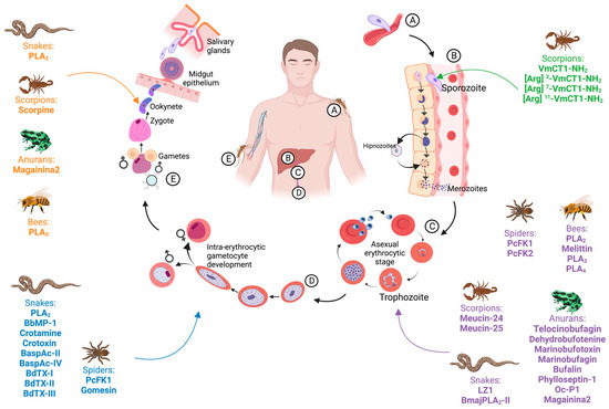 Plasmodium life cycle, showing the points at which toxins from animal venoms can act. Inoculation of sporozoites into the host’s epidermis (A); hepatic and pre-erythrocytic stage (B); erythrocytic stage (C); intraerythrocytic phase and gametocyte development (D); Anopheles spp. infection and parasite development in the mosquito midgut (E); male gamete (♂); female gamete (♀).