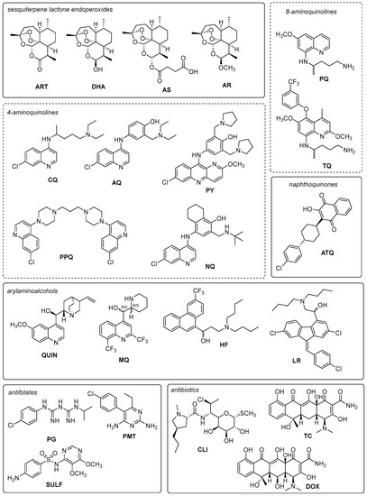 The available antimalarials are categorized into seven classes: (a) sesquiterpene lactone endoperoxides compounds: artemisinin (ART), dihydroartemisinin (DHA), artesunate (AS) and artemether (AR); (b) 4-aminoquinolines: chloroquine (CQ), amodiaquine (AQ), pyronaridine (PY), piperaquine (PPQ) and naphthoquine (NQ); (c) arylaminoalcohols: quinine (QUIN), mefloquine (MQ), halofantrine (HF) and lumefantrine (LR); (d) 8-aminoquinolines: primaquine (PQ) and tafenoquine (TQ); (e) antifolates: proguanil (PG), pyrimethamine (PMT) and sulfadoxine (SULF); f) naphthoquinones: atovaquone (ATQ) and (g) antibiotics: clindamycin (CLI), doxycycline (DOX) and tetracycline (TC) (Table 2, Figure 2). Their mechanisms of action are summarized in Table 2.