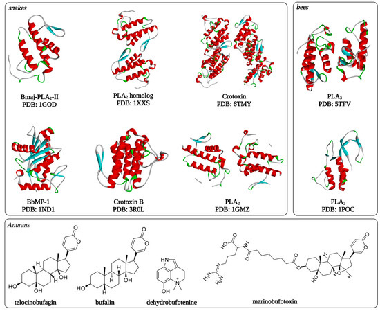 - Medeiros, D.S.S.; Rego, T.B.; Dos Santos, A.P.d.A.; Pontes, A.S.; Moreira-Dill, L.S.; Matos, N.B.; Zuliani, J.P.; Stábeli, R.G.; Teles, C.B.G.; Soares, A.M.; et al. Biochemical and Biological Profile of Parotoid Secretion of the Amazonian Rhinella marina (Anura: Bufonidae). BioMed Res. Int. 2019, 2019, 2492315. [Google Scholar] [CrossRef]