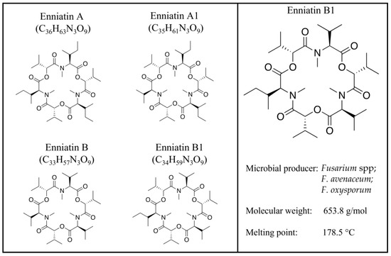 ENN B1 presents several different biological characteristics, most of which are in common with other ENNs derived from Fusarium spp. [8,9]. The biological characteristics of ENN B1 are summarized in Figure 2A and Table 1.