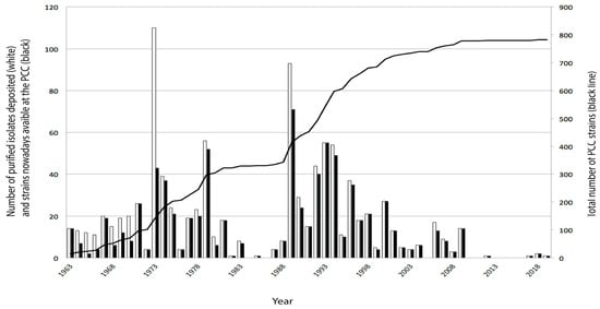 Number of axenic monoclonal cyanobacterial strains of the PCC obtained over the years 1963–2019 (in white), cultures still preserved today (2023, in black), and total number of PCC strains (black line and second vertical axis).
