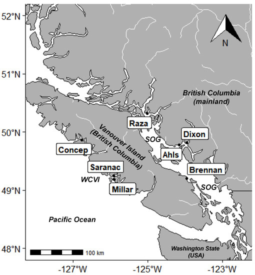 Location of sampling sites in British Columbia, Canada. Outlined labels indicate farm sites: Concepcion (Concep.), Saranac Island (Saranac), Millar Island (Millar), Raza Island (Raza), Ahlstrom (Ahls), Dixon Bay (Dixon), and Brennan Island (Brennan). SOG—Strait of Georgia, WCVI—west coast Vancouver Island.