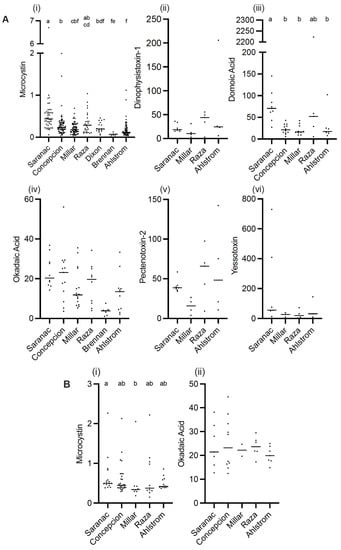 Toxin concentrations for each site over the time period collected for SPATT (A) and discrete water samples (B). SPATT (A): microcystin (MC; ng MC/g resin (dry weight)/day) (i); domoic acid (DA; pg DA/g resin dry weight/day) (ii); dinophysistoxin-1 (DTX-1; ng DTX-1/g resin dry weight/day) (iii); okadaic acid (OA; ng OA/g resin dry weight/day) (iv); pectenotoxin-2 (PTX-2; ng PTX-2/g resin dry weight/day) (v); yessotoxin (YTX; ng YTX/g resin dry weight/day) (vi). Discrete water: MC (ng MC/L) (i); OA (ng OA/L) (ii). Data are mean ± SEM; different letters indicate significant differences (p < 0.05) in toxin concentration between sites; see text for details.