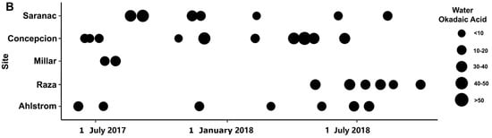 Okadaic acid was detected in all SPATT and water extracts from all sites measured (Figure 4). Concentrations of OA in SPATT ranged from 1.087 to 56.06 ng OA/g resin dry weight/day (Figure 2A; Table 2), which were lower than levels detected in SPATT samples from Southern California [18], but comparable to those in Chesapeake Bay and Virginia coastal bays [23]. Water concentrations ranged from 12.41 to 44.56 µg/L (Figure 4B; Table 2); however, since OA is easily accumulated by shellfish and finfish, and subsequently consumed by humans, resulting in diarrhetic shellfish poisoning (DSP), most studies measure OA concentrations in mussel tissue for which the regulatory guideline is 160 µg/kg [17,58,72]. It was unclear whether the levels of OA measured in SPATT and water samples during this study represent a threat to wildlife and humans. However, in BC, the threat posed by diarrhetic shellfish toxin (DST), which include OA, has resulted in the periodic closure of shellfish harvesting areas [3]. Dinoflagellates of the genus Alexandrium, which produce OA, have been observed to be abundant in BC’s Strait of Georgia (SOG) from 2015 to 2017. These organisms, which were most common in shallower nearshore regions, but did not result in heavy blooms, were found to be negatively affected by the 2015 El Niño conditions and positively by the 2017 La Niña conditions [73], indicating OA levels may vary greatly depending on climatic changes. Species of Dinophysis, another potential source of OA, were estimated to have increased in surface abundance by up to 10% between 2017 and 2019 in SOG surface waters, where 4 of our sampling sites were located, and by up to >21% in the region near the Ahlstrom site (https://maps.sogdatacentre.ca/documents/psfsogdc::harmful-algae-map-document-series-sog-dinophysis-abundance-for-2015-to-2019/explore; accessed on 12 May 2023).