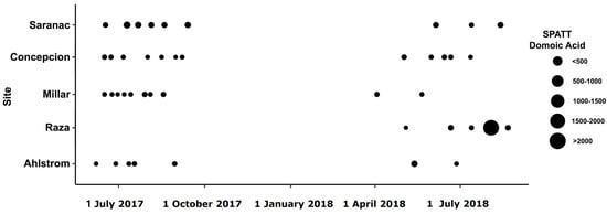 SPATT extracts tested positive for multiple toxins (Figure 2A, Figure 3A, Figure 4A and Figure 5), showing that they co-occur in time and space. Of the 283 SPATT extracts analyzed for MC, 48 were analyzed for either DA or OA, and 27 for both DA and OA, all of which were found to contain these toxins. Some extracts were also analyzed using LC-MS/MS, which indicated that 17 extracts had 6 co-occurring toxins and 1 extract had 3 co-occurring toxins (Figure 6).