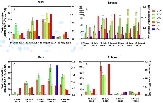 Concentrations of co-occurring toxins found in SPATT at Miller (A), Saranac (B), Raza (C), and Ahlstrom (D) at selected dates during 2017 and 2018 (Day Month Year). Dinophysistoxin-1 (DTX-1; ng DTX-1/g resin dry weight/day), pectenotoxin-2 (PTX-2; ng PTX-2/g resin dry weight/day), and yessotoxin (YTX; ng YTX/g resin dry weight/day) were measured using LC-MS/MS. Reproducibility was evaluated for LC-MS/MS by running a test sample 7 times, which yielded relative standard deviation (RSD) values of 14.2, 13.1 and 19.0%, respectively, for DTX1, PTX2, and YTX; standard deviation for each sample was calculated using RSD to produce error bars for these toxins. Okadaic acid (OA; ng OA/g resin dry weight/day), microcystin (MC; ng MC/g resin dry weight/day), and domoic acid (DA; ng DA/g resin dry weight/day) were measured using ELISA; error bars could not be calculated for individual samples measured using ELISA.