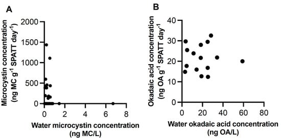 Correlation of microcystin (A) and okadaic acid (B) in SPATT and water samples. SPATT values were ng toxin/g of dry weight of SPATT resin/ day of deployment time; these were compared to toxin concentration in water (ng toxin/L) collected at the same time SPATT bags were collected.