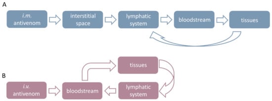 Other than antibody specificity and concentration, as well as the composition profile, antivenom efficacy might be highly influenced by the route of administration as well. There is no standardized protocol for antivenom administration across Europe, similar to many other regions of the world []. It is a WHO recommendation [] that, whenever possible, snake antivenoms should be given intravenously (i.v.) due to the higher speed of distribution and greater bioavailability of neutralizing antibodies in comparison to other routes. Slow i.v. infusion over 30–45 min allows the cessation of antivenom administration if immediate adverse reactions develop []. I.v. administration is logistically more demanding as it must be performed under the close supervision of health care professionals within medical facilities. Their accessibility is often hindered by the remoteness of the snakebite-prone areas leading to the delayed transportation and, consequently, treatment of victims, which ultimately reduces the chances of a successful therapy outcome [,,,]. Intramuscular (i.m.) administration brings a notably lower risk of antivenom-associated side effects and is easier to give in resource-poor or remote settings in the absence of expert medical aid []. However, there is a prevailing opinion that the i.m. route is less effective and leads to lower bioavailability, a longer time to reach the maximum concentration and a delayed and incomplete neutralization of toxins []. Blood levels never reach those rapidly achieved by i.v. application. Therefore, the WHO advises the i.m. route as an alternative approach at peripheral first aid stations far from medical care, as well as in the case when i.v. access has proven to be impossible []. Local administration of antivenom at the site of the bite should not be performed, as it is extremely painful and may increase intracompartmental pressure []. Accordingly, the majority of commercially available antivenoms are intended for i.v. infusion. The exceptions are those aimed for the treatment of other venomous animals’ bites/stings [,], which are either consistently given i.m., despite the increasing concerns of their lower effectiveness when applied by this path [], or by both the i.v. and i.m. routes, since it is still unclear which one is more effective []. In the case of snakebites, i.v. administration represents the method of choice whenever professional medical care is available [,,]. However, there is also a significant number of manufacturers whose products are still prescribed for i.m. and/or s.c. application [,,,,,,,]. It might represent a not-so-incomprehensible concept if snake venoms are anticipated as complex mixtures of proteins with variable molecular mass that are, in most envenomation cases, injected into the interstitial space either by the s.c. or i.m. route [] and whose absorption into the bloodstream may occur by the way of blood capillaries or small lymphatic vessels, depending on their size []. Consequently, venom components exhibit different toxicokinetic profiles []. On the other hand, antivenoms with a uniform composition, which involves only large molecules, if given by the same route, reach the central compartment by slow diffusion into the initial lymphatics [,]. In addition, there is proof that the lymphatic system not only plays a role in venom distribution and bioavailability [] but also serves as a compartment where antivenom, extravasated from the blood after i.v. administration, eliminates a substantial amount of toxins before lymph reaches the systemic circulation []. For now, there are no cognitions about i.m. antivenom-mediated neutralization within the lymphatics.