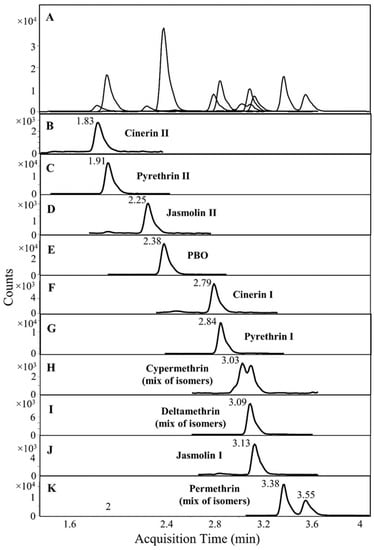 (A) LC-MS/MS chromatogram of eluting pyrethrins, pyrethroids, and PBO in a spiked feed sample containing 112.2 µg/kg of pyrethrin I, 55.6 µg/kg of pyrethrin II, 11.4 µg/kg of cinerin I, 7.6 µg/kg of cinerin II, 8 µg/kg of jasmolin I, 5.4 µg/kg of jasmolin I II, 200 µg/kg of cypermetherin, deltamethrin and permethrin, and 20 µg/kg of PBO. (B–K) Individual MRM chromatograms of pyrethrins, pyrethroids, and PBO.