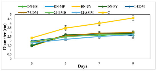 The colony diameters of cultures that interacted with Moesziomyces bullatus DN-FY, Metschnikowia aff. pulcherrima DN-MP, Metschnikowia aff. fructicola 1-UDM and Metschnikowia pulcherrima 26-BMD were statistically different on day 3 of incubation compared with other incubation periods (p < 0.05). However, control plate colony diameters were statistically different over the incubation period. Additionally, after 9 days of incubation, fungal colony diameters of all yeast isolates were statistically different from the control plates. Results are expressed as colony diameters (mm) over 9 days of the incubation period (Table 2).