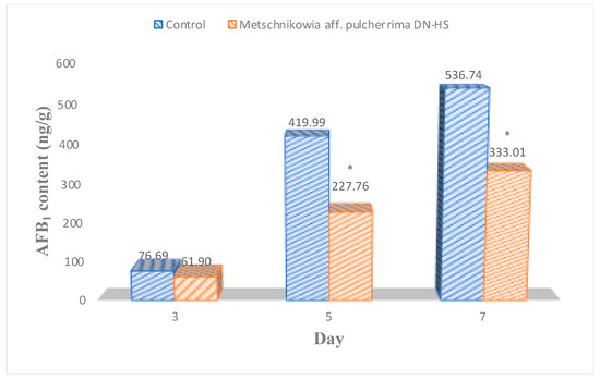 Hazelnut samples treated with M. aff. pulcherrima DN-HS; AFB1 content after different incubation periods. * Average values that are significantly different from the control based on the t-test (p < 0.05) are indicated by an asterisk in each column.