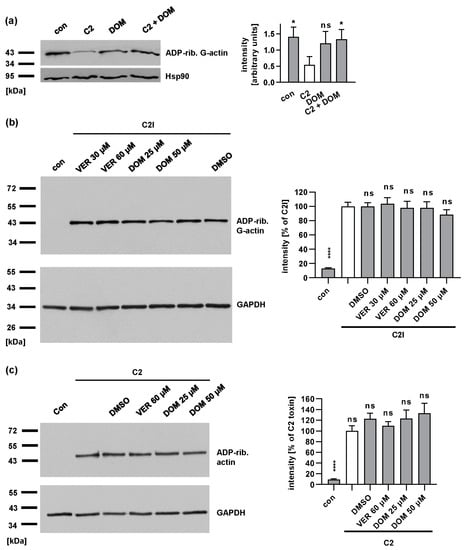 2.2. Domperidone Reduces the Amount of ADP-Ribosylated G-Actin in Cells without Affecting the C2I Enzyme Activity In Vitro or the Binding of C2 Toxin to Cells