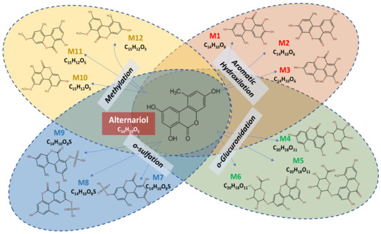 Other phase II enzymes are sulfotransferases catalyzing the sulfation of xenobiotics or endogenous compounds [48]. AOH-sulfates that resulted from the sulfation reaction were detected in plants [14,49,50] and as compounds resulting from AOH metabolism in a CaCo2 cell model [37], or in the urine and feces of rats [51]. With the exception of the metabolites that resulted from methylation, all the other compounds were predicted to be substrates for sulfotransferase (Figure 4).