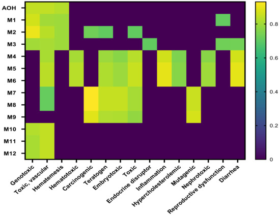 Heatmap of predicted toxic effects of AOH and its metabolites.