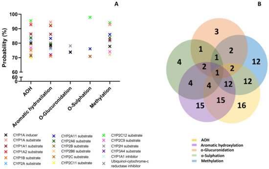 Prediction effects of AOH and predicted metabolites on different isoforms of Phase I enzymes (A). Venn diagram showing the number of effects predicted for the parent compound and for each class of metabolites (B).
