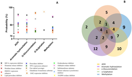 Metabolites resulting from aromatic hydroxylation had the highest predicted probability involvement in the reactions associated with the oxidative stress (12 predicted reactions), followed by AOH (10 predicted reactions), as presented in the Venn diagram (Figure 5B). The lowest involvement in oxidative stress was predicted for the metabolites resulting from the reaction of o-sulfation with only two predicted reactions. All the analyzed compounds were predicted to inhibit the expression of HIF1A (>73%). With the exception of metabolites M7–M9, all the compounds were predicted to enhance TP53 expression and inhibit lipid peroxidase (>71%). Only AOH and metabolites M1–M3 may enhance the expression of heme-oxygenase 1 (HMOX1) (probability > 73%). AOH and metabolites from aromatic hydroxylation and methylation were predicted to inhibit some enzymes involved in the oxidative stress response, such as histidine kinase, nitrate reductase, peroxidase, and aldehyde oxidase (probability > 71%). Metabolites M1–M3 and M10–M12 were predicted to inhibit Jak2 expression (probability > 72%). As already described in Figure 5, only the metabolites resulting from the o-sulfation reaction were predicted to act as substrates for GST.