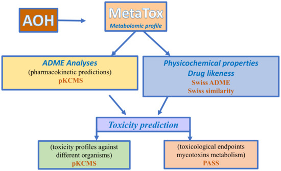 The present study aimed to predict Phase I and II metabolites of alternariol as well as develop a detailed ADME/Tox profile for AOH and predicted metabolites using an in-silico workflow based on MetaTox, SwissADME, pKCMS, and PASS online software of computational toxicology in order to provide additional toxicological data for AOH toxicity.