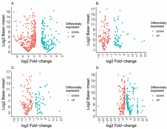 Volcano plot of analysis of transcripts significantly differentially expressed in Phoneutria depilata. Down transcripts differentially expressed are indicated as pink spots and up as the blue plot. (A) SEX_only, (B) Invertebrate diet, (C) Mixed diet, (D) Vertebrate diet.