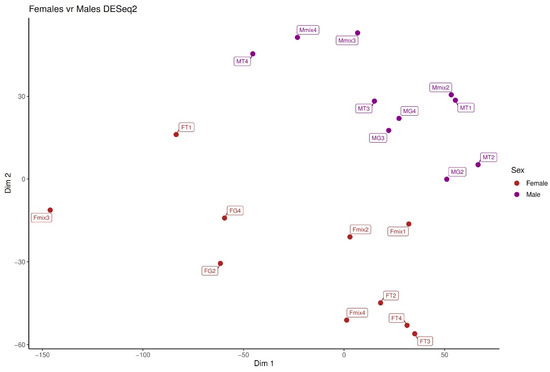 This work represents the first comparative venom gland transcriptome analysis conducted for P. depilata across three diets (vertebrate, mixed, and invertebrate) and the sexes. Our results indicate that there are no differences in DETs across the diets analyzed, but there are significant differences between the sexes, with 59 transcripts being differentially expressed. The mean number of transcripts in females is three times higher (418,166) than in males (112,808). The results show that although the same genes are expressed in both sexes, the venom glands of females express a greater number of components than those of males (see Supplementary Table S3).