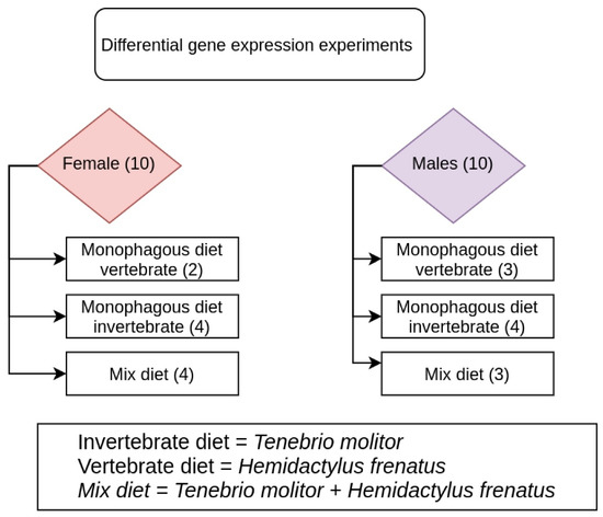 Our results show that the total number of transcripts differed between the ten males and ten females is of 5,309,740, with a means by sample of 265,487. However, the mean number of transcripts among females is 418,166 (Standard Deviation (SD) of 263,840) compared to a mean of 112,808 in males (SD 53,589). This is a significant difference between the numbers of transcripts expressed in the two sexes (p < 0.001). Likewise, when considering only diet as a factor, a slightly higher number of expressed transcripts is observed in the vertebrate diet group (299,081 ± 214,885) than in the mixed diet (246,929 ± 254,965) and invertebrate diet (316,913 ± 308,802). The number of differentially expressed transcripts per gene and per isoform in each sample normalized is summarized in the Supplementary Table S3.