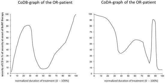 Only one patient (1/66 = 1.5%) drew a CoDB and a CoDA graph, which could not be classified according to the main curvature since he had experienced long-lasting periods of severe worsening, followed by relapses. This occurred before and after BoNT therapy. (See Figure 3, left and right). Obviously, this is a rare and special variant of CD. Longer-lasting relapses have been previously described in about 5% of the patients [48].